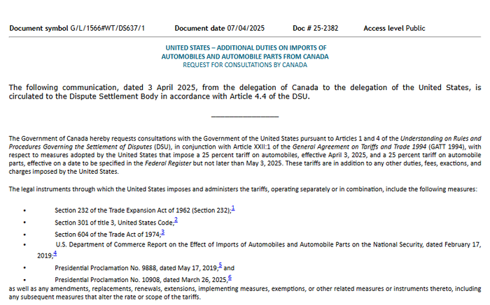 4月7日,根据世界贸易组织(WTO)最新发布的一份文件,加拿大正式就美国对汽车及零部件实施的25%高额关税措施,向世贸组织提起争端申诉。此举引发了国际经贸领域的广泛关注。