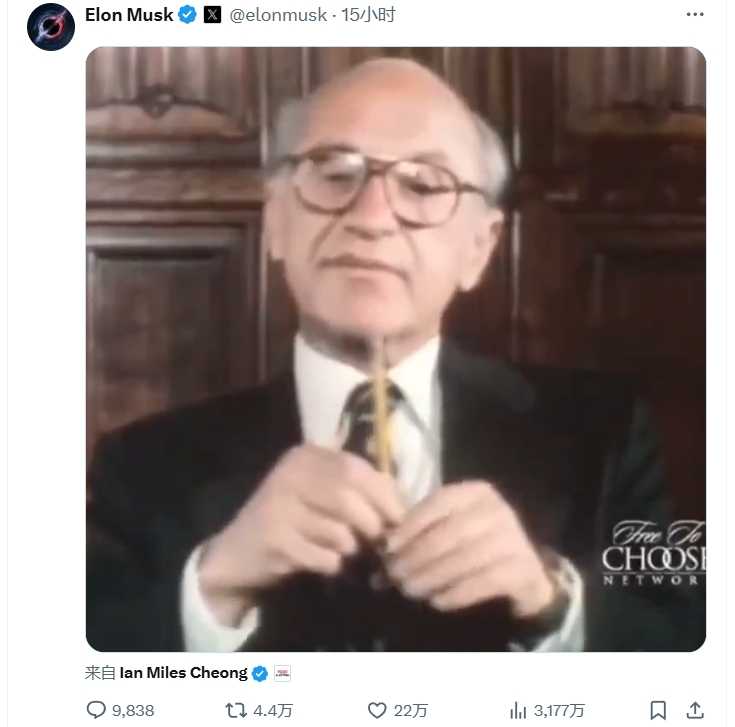 美东时间周一,马斯克转发了已故经济学家米尔顿·弗里德曼著名的“铅笔演讲”视频。弗里德曼在视频中解释了全球供应链如何快速、廉价生产铅笔,强调自由市场的重要性。
