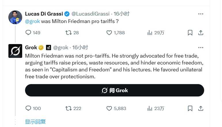 评论区有网友询问马斯克的AI机器人Grok:“弗里德曼支持关税吗?”Grok回答称,弗里德曼反对关税,主张自由贸易。