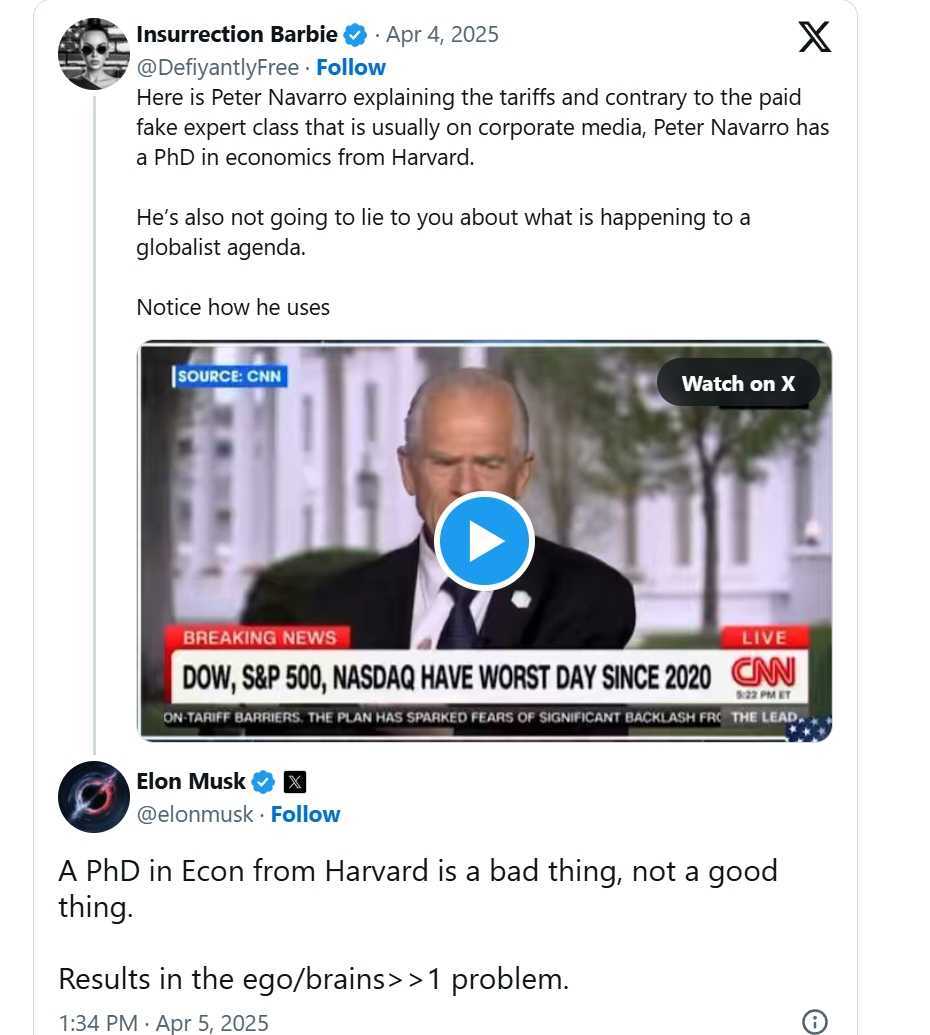 在转发视频前,马斯克已猛烈抨击过特朗普政府的关税倡导者彼得·纳瓦罗,讽刺其经济学博士学位导致“精神/大脑出现问题”。纳瓦罗则指责马斯克保护自己的经济利益。