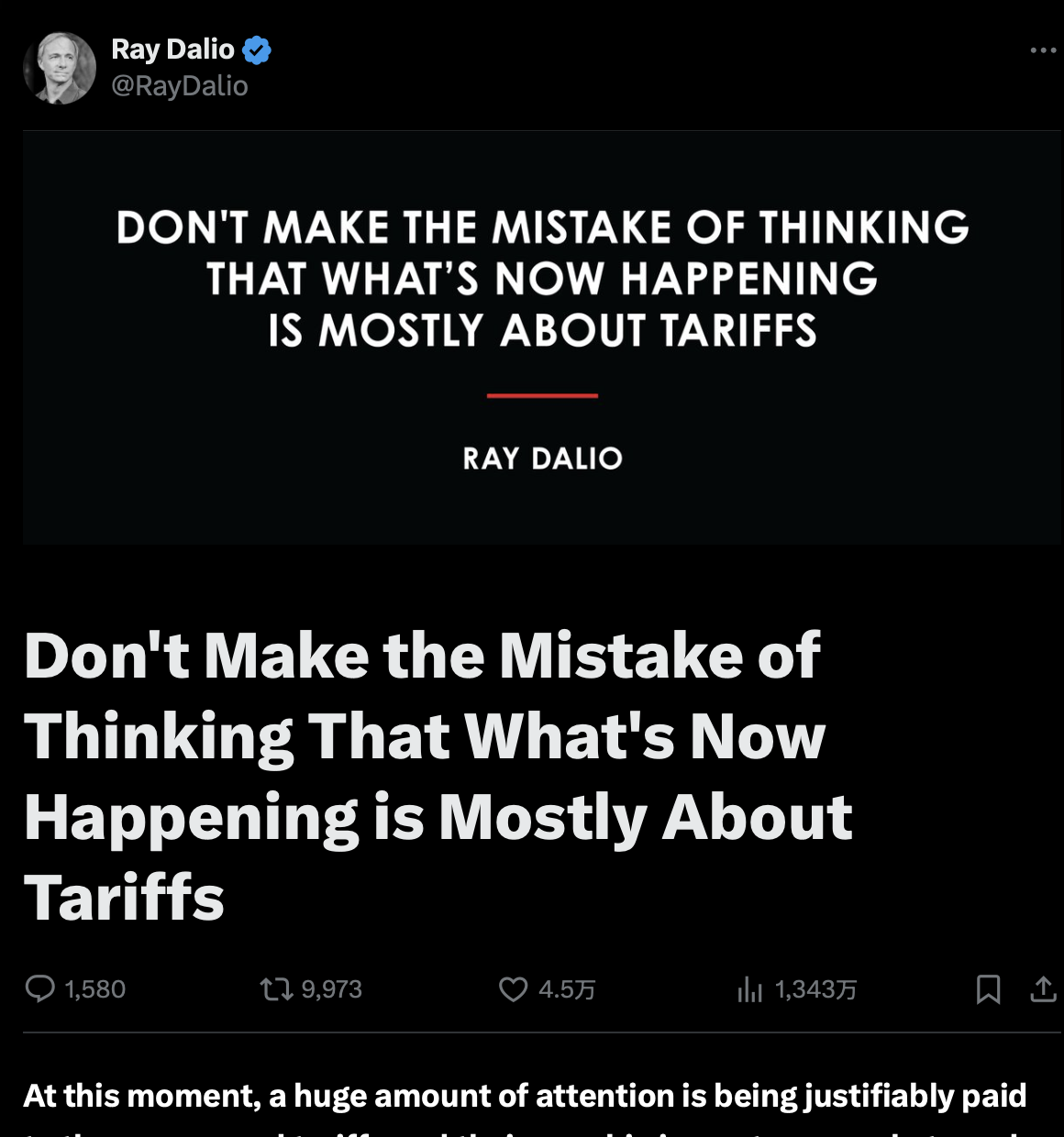 达利欧在2021年出版的《原则: 应对变化中的世界秩序 》一书中详细阐述了这一观点。随着特朗普时期对等关税政策引发全球市场动荡,达利欧周二在社交媒体平台X上发文,呼吁人们关注导致特朗普当选及其激进贸易政策的深层次因素。