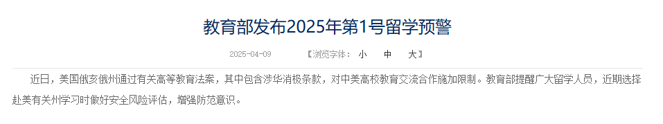 美国俄亥俄州通过包含涉华消极条款的高等教育法案,限制中美高校教育交流合作。教育部提醒广大留学人员,选择赴美俄亥俄州学习时需做好安全风险评估,增强防范意识,以保障自身安全和合法权益。