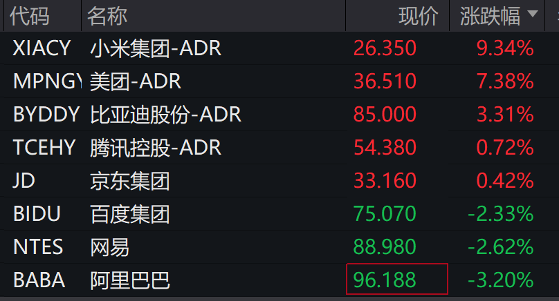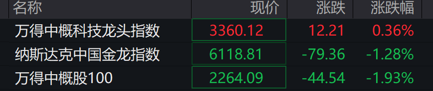 中概股涨跌不一,纳斯达克中国金龙指数跌超1%,而万得中概科技龙头指数上涨0.36%。个股方面,小米集团涨超9%,美团涨超7%,而阿里巴巴和百度集团分别下跌超过3%和2%。