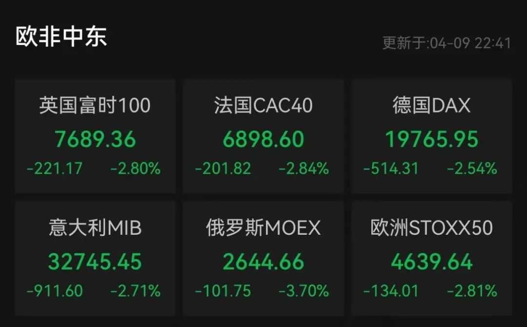 4月9日美股集体高开后跳水,标普500和道指转跌。黄金价格飙涨,国际金价大涨站上3080美元/盎司。特朗普发动贸易战导致美债抛售加剧,美联储卡什卡利表示关税可能导致美国GDP下降。中国和欧盟对美国采取反制措施,欧洲股市集体下跌。