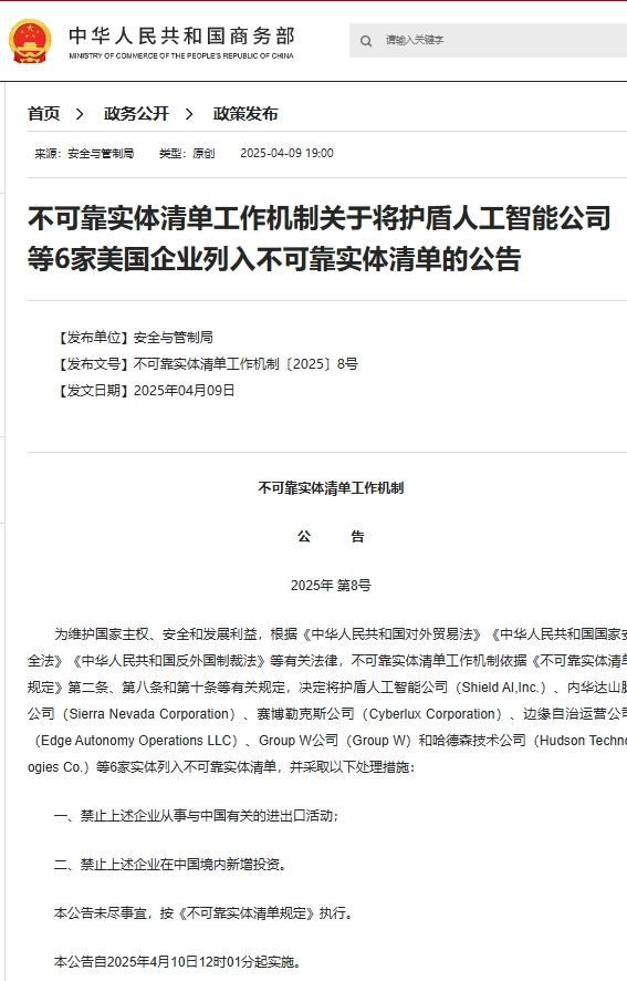 2025年4月9日,中国政府发布公告,将护盾人工智能公司等6家美国企业列入不可靠实体清单,全面禁止其参与与中国相关的进出口活动,并阻止其在中国境内新增投资,此举旨在强化国家安全防线。