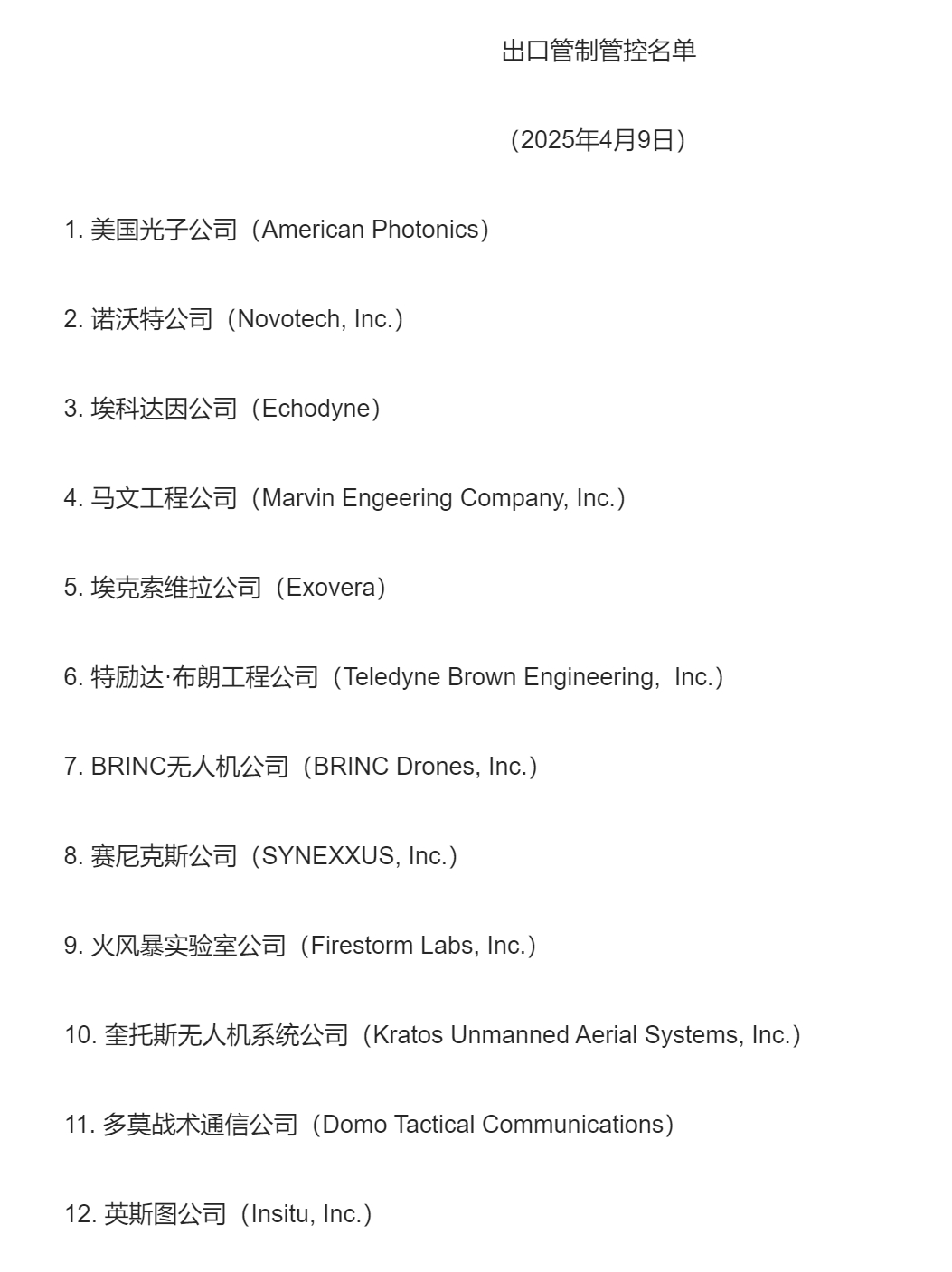 商务部今日正式发布公告,宣布将美国光子公司等12家美国企业纳入出口管制名单(详见附件),并明确两项重要措施。首先,自公告生效起,禁止向这些实体出口两用物品,已开展的相关出口活动需立即中止。其次,针对特殊情况下的必要出口,出口经营者需向商务部提交申请。此举标志着我国出口管制政策进一步升级,加强了对敏感技术和产品的管控力度。公告自2025年4月10日12时01分起正式生效。