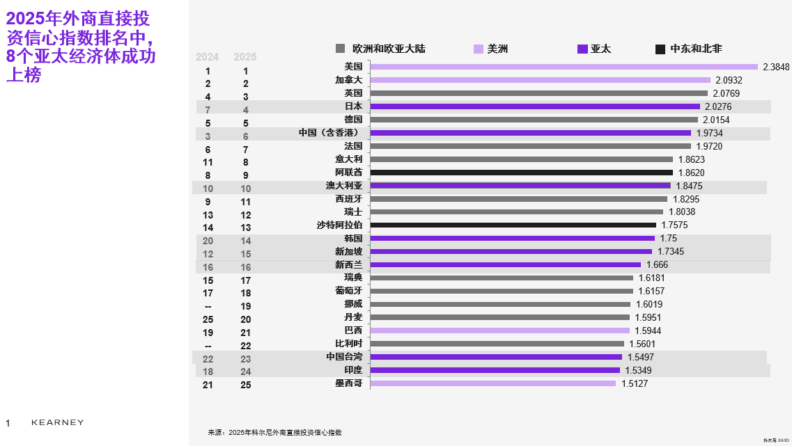 至报告发布的4月,部分担忧已变为现实。科尔尼全球商业政策委员会董事Terry Toland分析指出,特朗普的关税政策可能对亚太地区产生深远影响,这在FDICI报告排名中已有体现,如新加坡排名下滑至第15位,印度降至第24位。
