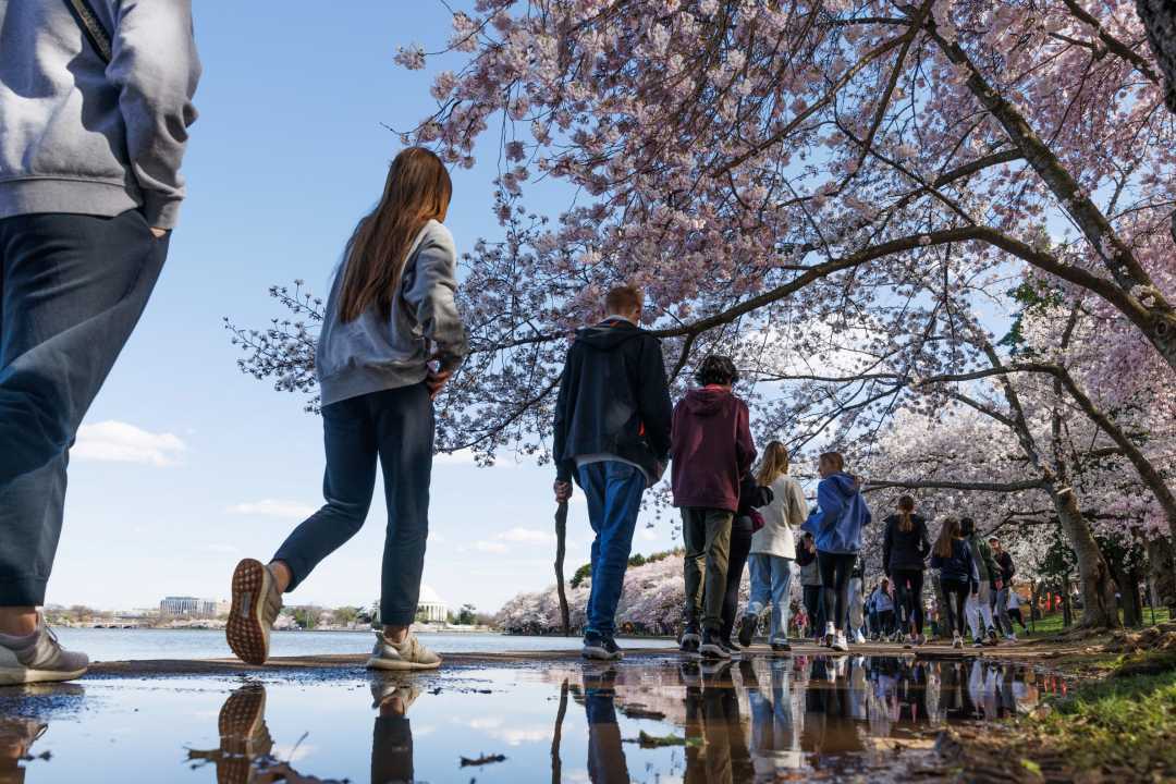 2024年3月18日,人们从美国华盛顿潮汐湖畔的樱花树下走过。新华社发(亚伦摄)