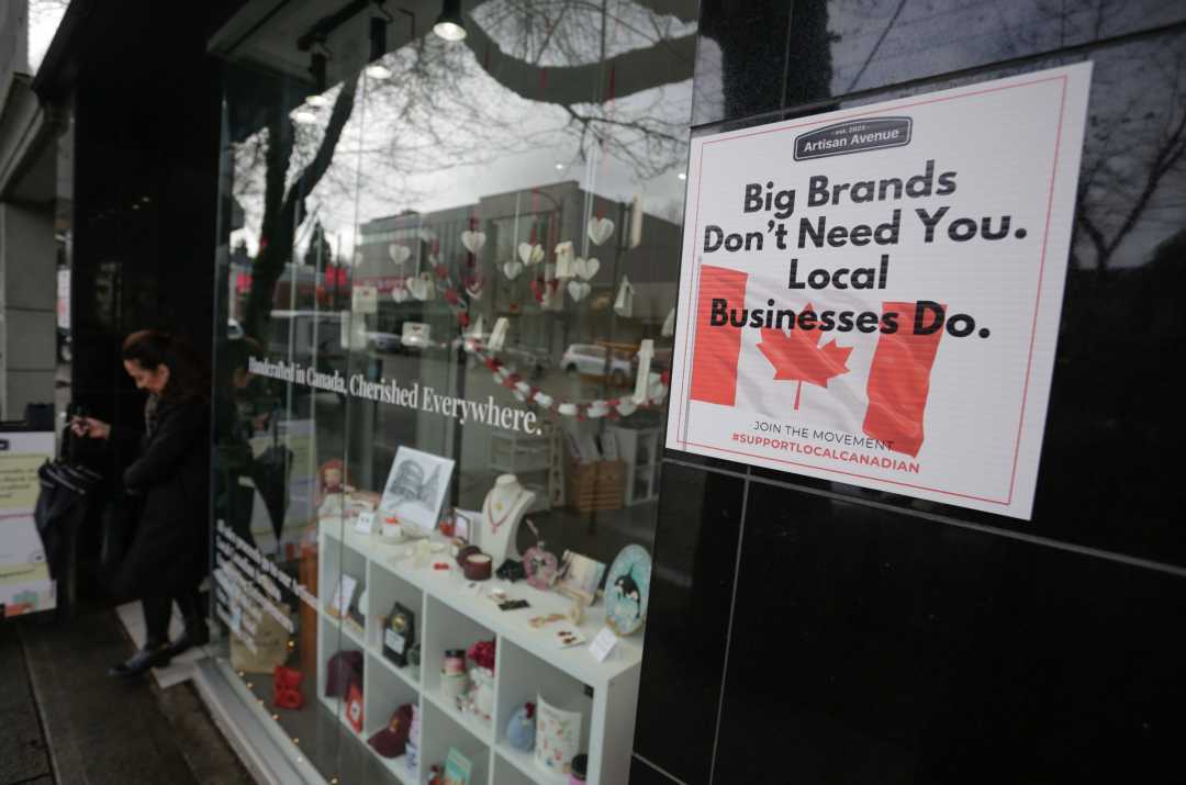 2月25日,加拿大温哥华一家商店外张贴着宣传本地企业的标牌。新华社发(梁森摄)