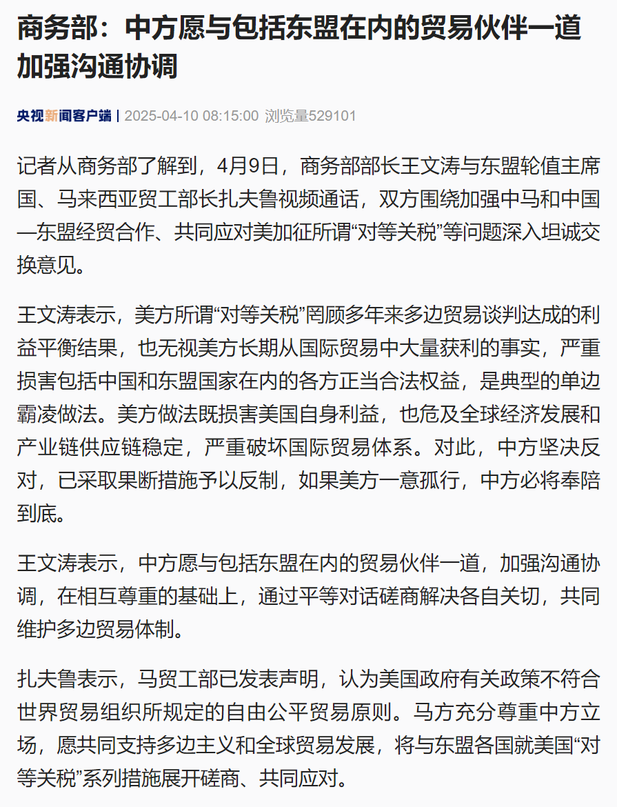 记者从商务部了解到,4月9日,商务部部长王文涛与东盟轮值主席国、马来西亚贸工部长扎夫鲁进行视频通话,双方就加强中马和中国—东盟经贸合作、共同应对美加征所谓“对等关税”等问题进行了深入坦诚的交流。此次通话旨在深化双边经贸关系,共同维护国际贸易秩序。