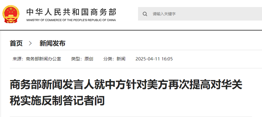 4月11日,国务院关税税则委员会发布公告,宣布调整对原产于美国的进口商品加征关税的税率,由84%提高至125%。鉴于当前关税水平下,美国输华商品已无市场接受可能性,中方已明确表示,若美方后续继续对中国输美商品加征关税,中方将不予理会。随后,商务部新闻发言人就中方的反制措施回答了记者提问。