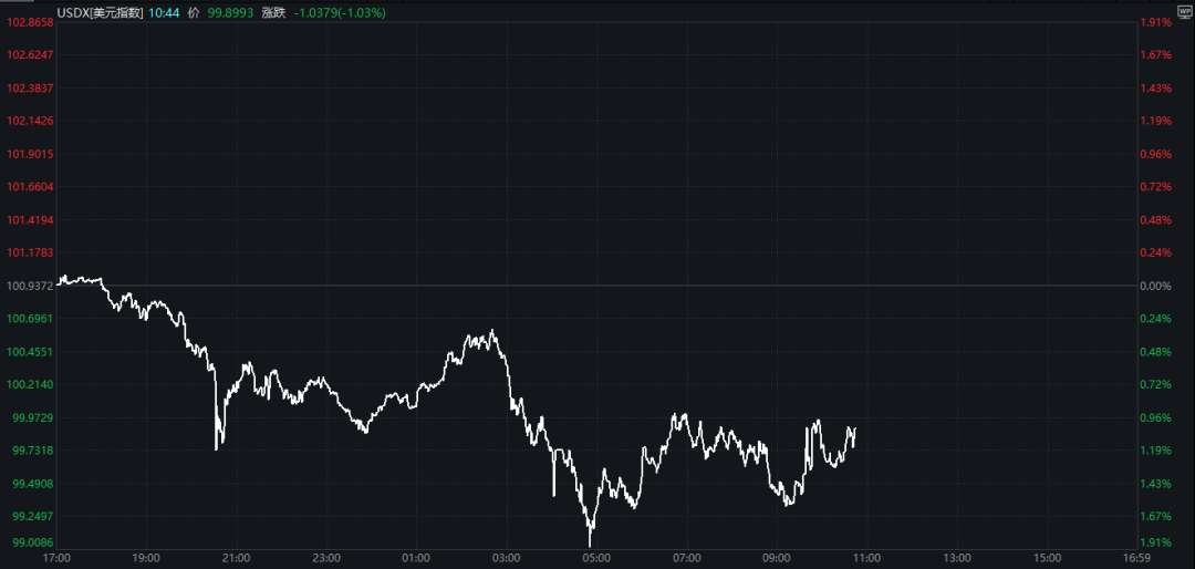 美元指数持续走低,21个月来首次跌破100点,跌幅超过1%。
