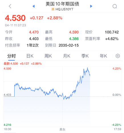 4月11日晚间,美债继续遭到大举抛售,美国市场动荡。欧盟考虑对美国科技公司征税。与此同时,美国消费者信心指数大幅恶化,通胀担忧升温,多位经济学家警告美国可能面临经济衰退。