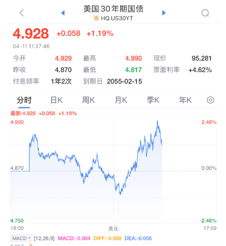 然而,今晚的主角并非美股,而是美债,继续遭到大举抛售。这个价值29万亿美元的市场正面临自2019年以来最严重的一周跌幅。4月11日,美债跌势继续扩大,美国10年期国债收益率触及2月以来最高水平。