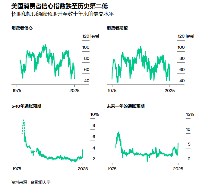 调查中的其他指标也全面恶化,包括当前经济状况指数和经济预期指数。多位华尔街高管和经济学家警告称,美国在未来一年可能面临经济衰退。尽管市场目前并不显现强烈的通胀担忧,但美联储官员担心消费者预期一旦改变行为,将迅速转化为现实通胀。