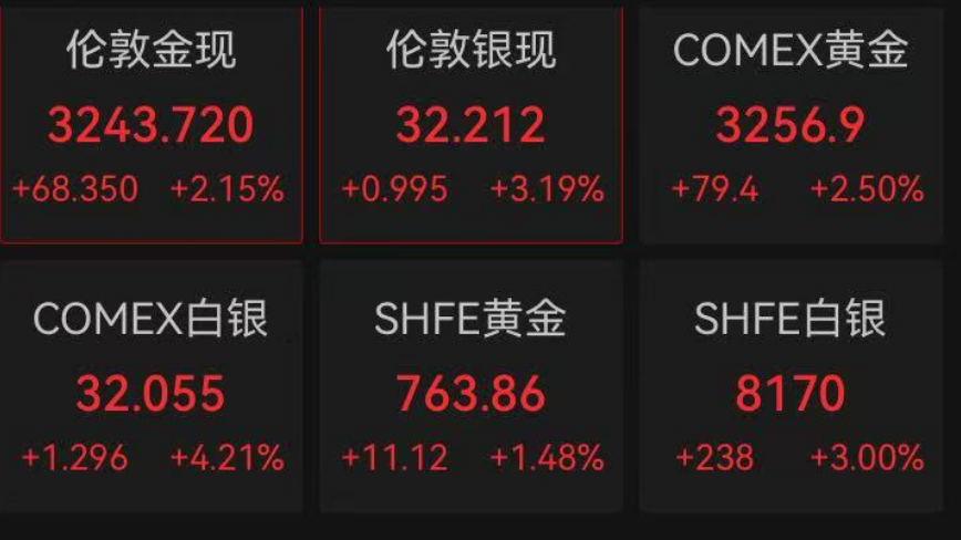 黄金市场延续涨势,现货黄金涨幅超过2%,目前每盎司报价3243.72美元。