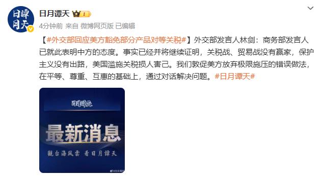 外交部发言人表示,关税战、贸易战没有赢家,保护主义行不通。中方敦促美方放弃极限施压,通过对话解决问题,共同维护国际经济秩序。