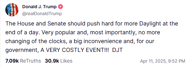 当地时间周五(4月11日),特朗普在社交平台Truth Social上发帖称,“众议院和参议院都应该大力推动延长日照时间,这很受欢迎,而且最重要的是,因为这将不用再调整时钟了,这会带来很大的不便,而且对我们的政府来说,这是一件非常昂贵的事情!”
