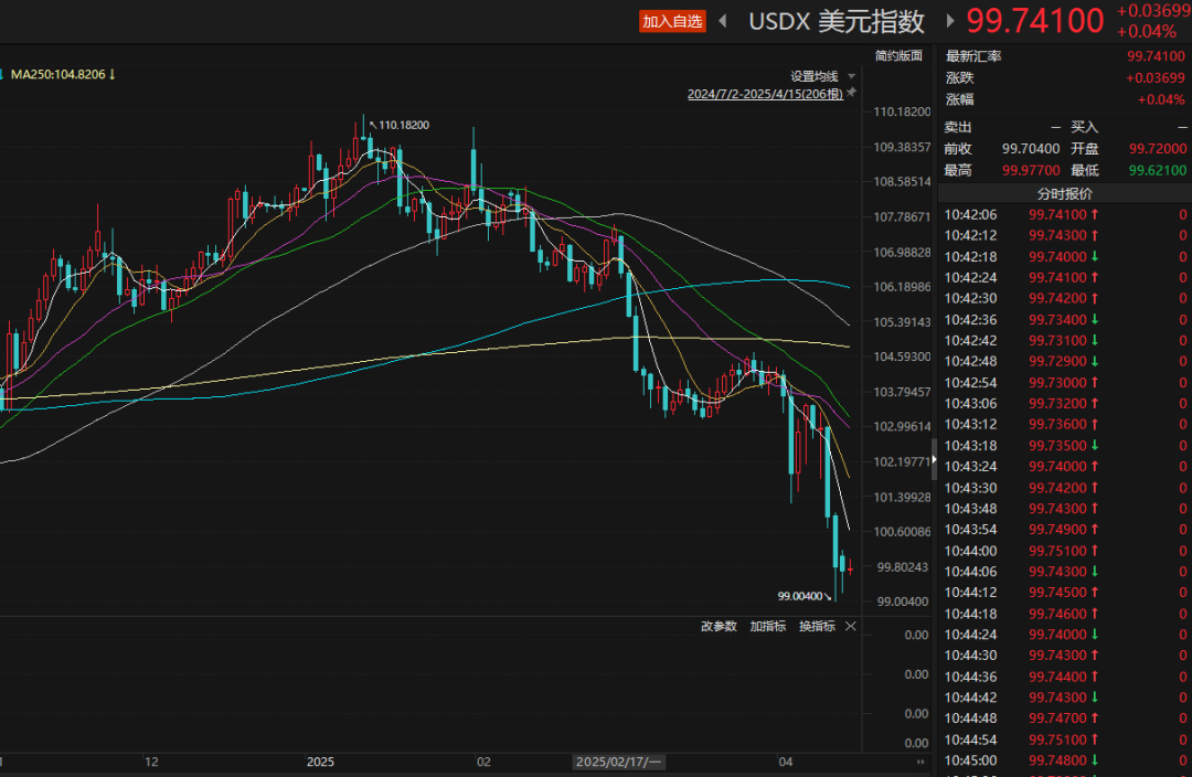 伴随美股剧烈震荡,美元指数同步下挫。数据显示,截至4月15日,美元指数今年以来已经下跌8.14%。富达基金表示,此次市场大幅下降中更令人不安的是美元的疲软,美元走势将是未来几周值得关注的一个关键指标。