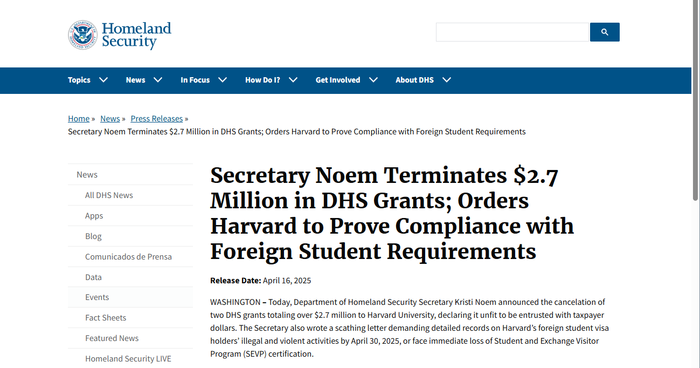 当地时间4月16日,美国国土安全部宣布,哈佛大学若未遵从特朗普政府要求分享部分签证持有人信息,将面临丧失招收外国学生资格的严厉措施。这一决定标志着美国政府对哈佛大学的施压进一步升级。