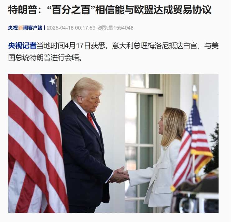 特朗普在多个场合表示对与意大利达成贸易协议充满信心,并强调“百分之百”有信心在90天的关税暂停期结束前与欧盟达成贸易协议。他还透露,美方已与多个国家举行了多次会谈,但并未急于宣布与特定国家的协议。
