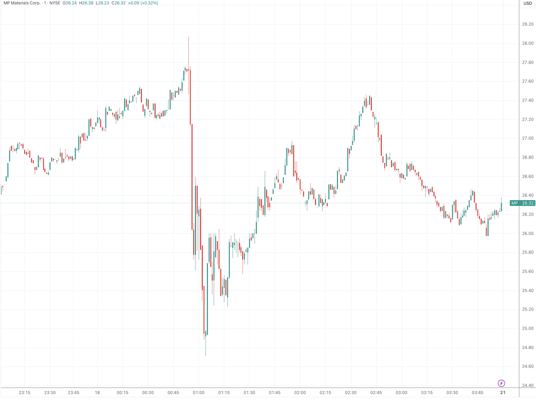 MP Materials周四确认,因“顶着125%的关税销售不符合商业逻辑”,该业务已停滞。此消息导致公司股价周四盘中短时跳水13%。但截至耶稣受难日小长假,MP Materials年内涨幅仍超60%。