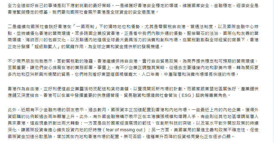 不少商界朋友表示,面对关税战阴霾,香港保持自由港和自由贸易政策,提供稳定和可预期的营商环境至关重要。事实上,不少企业正调整策略,从连接内地和欧美市场转向开拓更多内地和亚洲新兴市场。