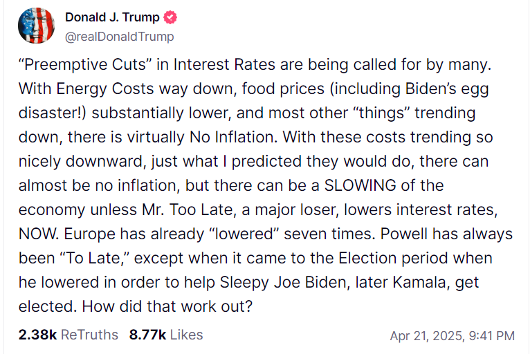 特朗普在Truth Social上发文称,当前能源和食品价格下降,通胀压力几乎不存在。然而,他指责鲍威尔称:“除非‘大输家’鲍威尔立即降息,否则经济可能会放缓。”