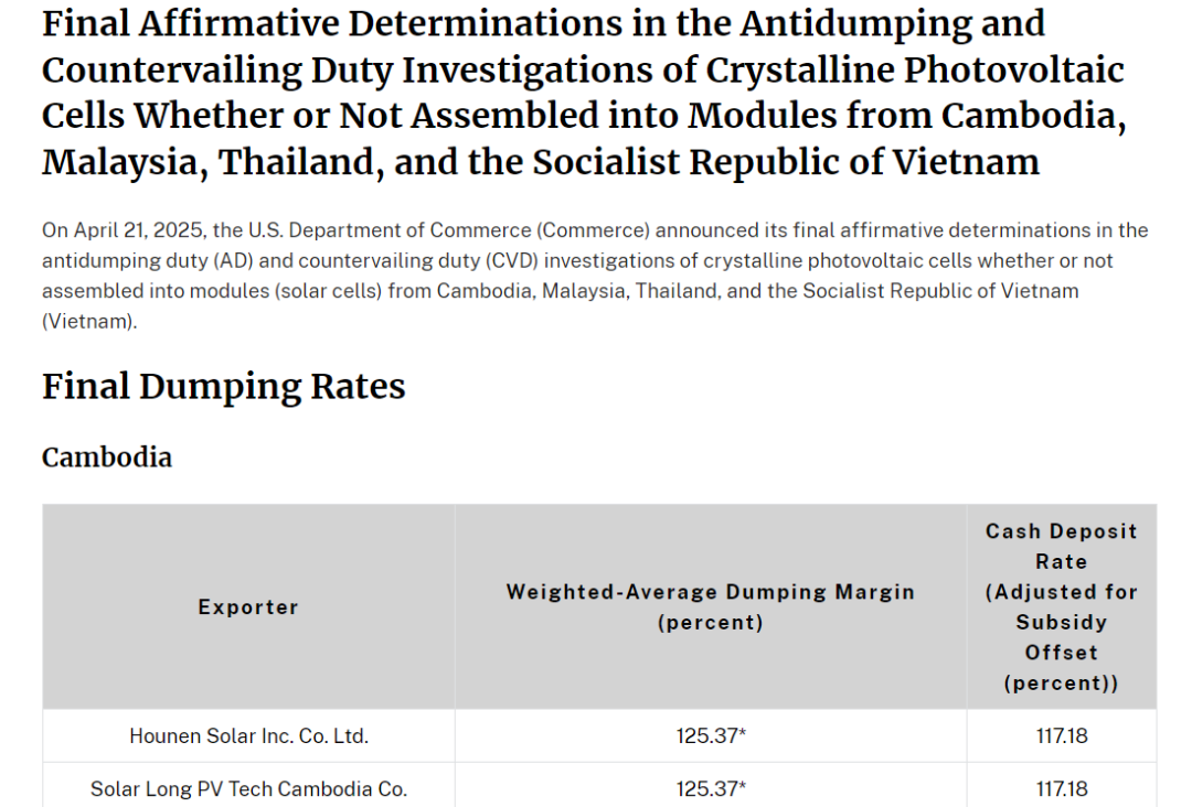 美国对新能源领域的施压持续升级。当地时间4月21日,美国商务部宣布对来自柬埔寨、马来西亚、泰国和越南的晶体光伏电池实施反倾销税和反补贴税(“双反”)调查的最终裁定,税率从6.1%至3403.96%不等。这四个国家目前供应美国约77%的光伏组件,去年对美出口太阳能设备总值达129亿美元。