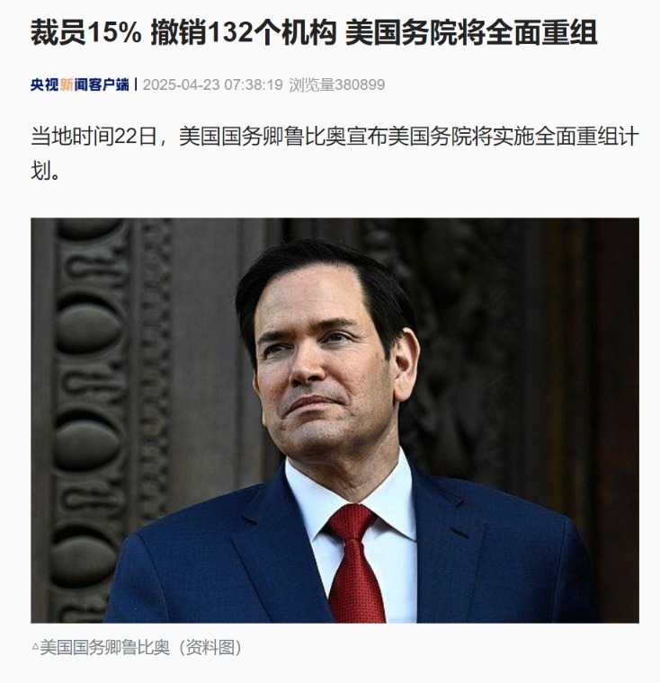 美国国务卿鲁比奥宣布将实施全面重组计划,旨在精简国务院人员,削减成本,并落实特朗普的“美国优先”外交政策。计划包括裁员15%,撤销132个办事机构,设立新机构应对新兴威胁。此举引发广泛关注和讨论。