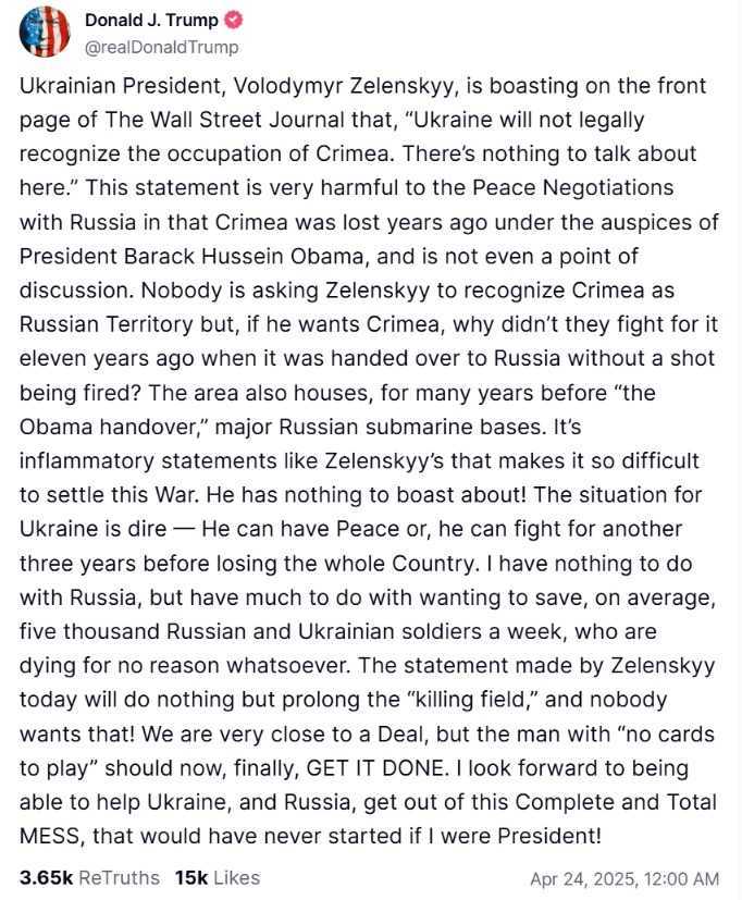 特朗普强调克里米亚问题是奥巴马政府时期的遗留问题,并非当前谈判重点,并继续鼓吹“非常接近达成协议”,催促泽连斯基尽快解决。