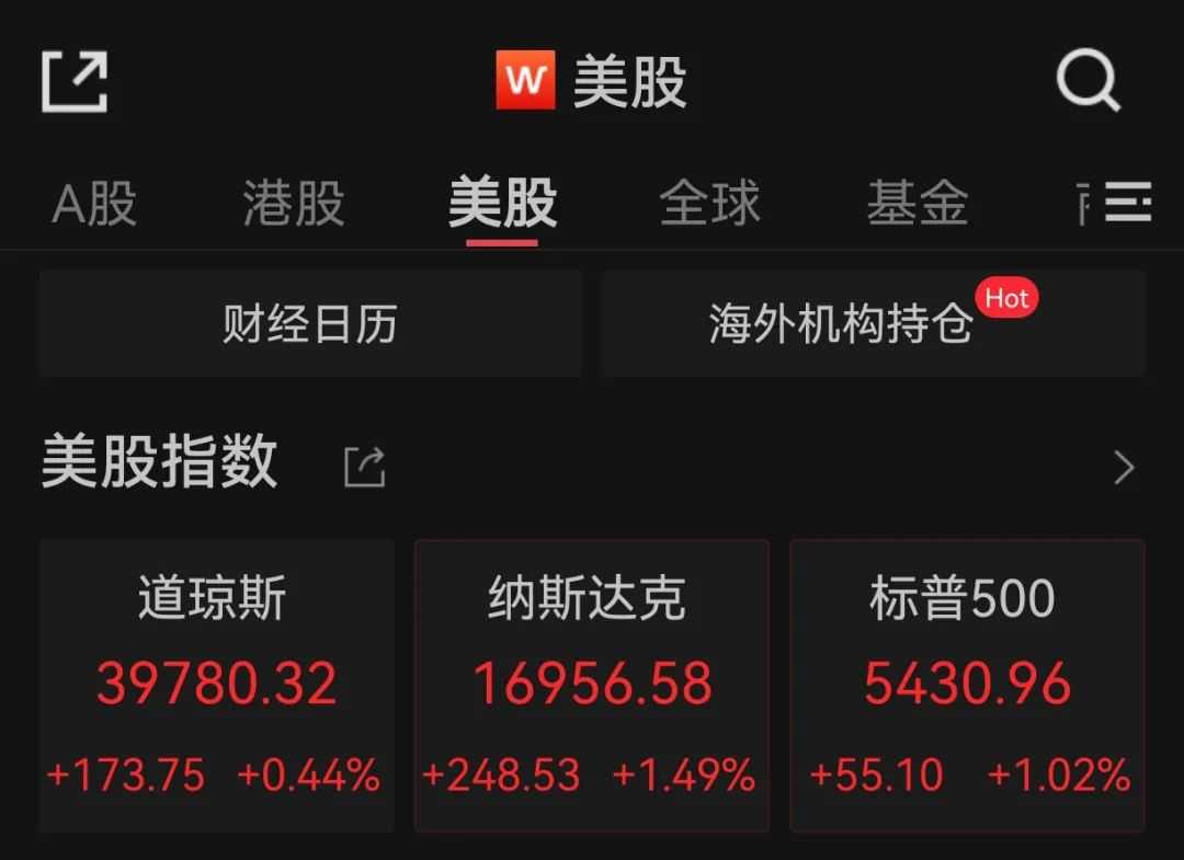 据Wind数据显示,截至北京时间4月24日22:49,道指、纳指、标普500指数分别上扬0.44%、1.49%、1.02%,表现抢眼。