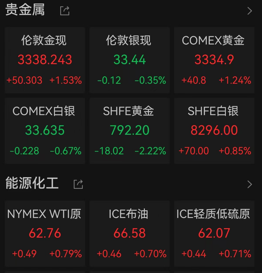截至22:49,COMEX黄金期货主力合约涨幅达到1.30%,成功站上3300美元/盎司关口,报3336.8美元/盎司;同时,NYMEX原油期货及ICE布油期货主力合约也上涨近1%,为市场增添助力。