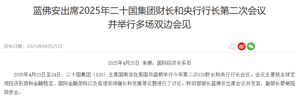 财政部、中国人民银行网站4月25日消息,4月23日至24日,二十国集团(G20)主席国南非在美国华盛顿举行今年第二次G20财长和央行行长会议。会议聚焦全球宏观经济、金融稳定、国际金融架构及非洲发展议题。财政部部长蓝佛安、中国人民银行行长潘功胜出席并发言。