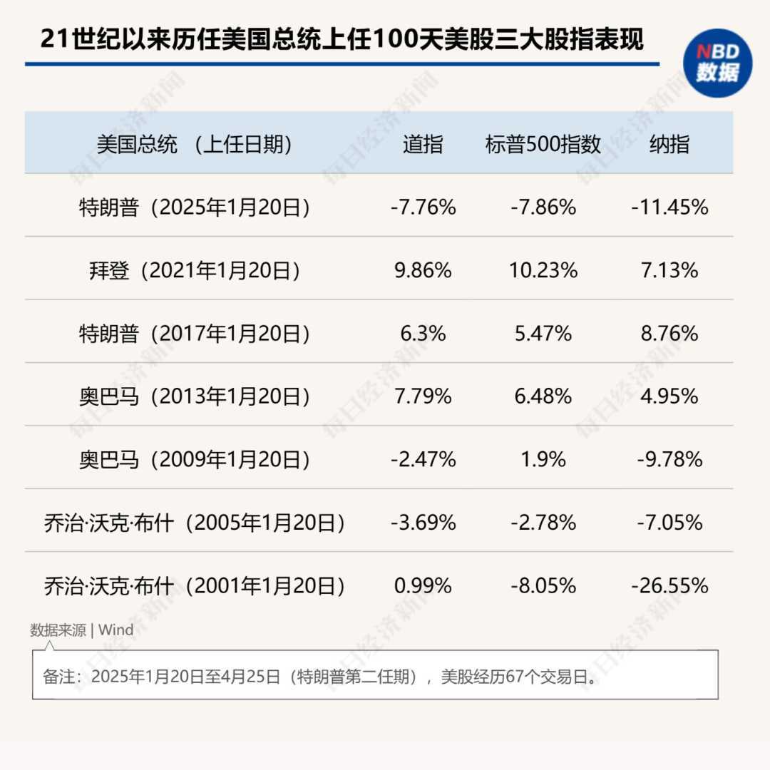 历史性低迷开局:从1月20日至4月25日,道琼斯工业平均指数累计下跌7.76%,标准普尔500指数下挫7.86%,纳斯达克综合指数更是暴跌11.45%。
