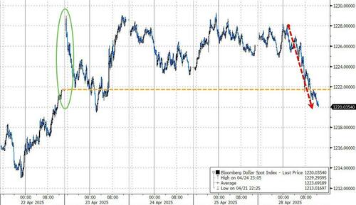 从特朗普重返白宫至4月25日,美元指数累计下跌近9%,或创1973年以来总统任期前100天最大跌幅。