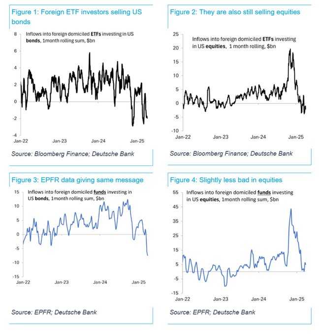 EPFR数据也印证德银ETF数据反映的趋势,显示美股买盘停滞,美债抛售更猛烈。两套数据存在差异,但总体趋势一致。