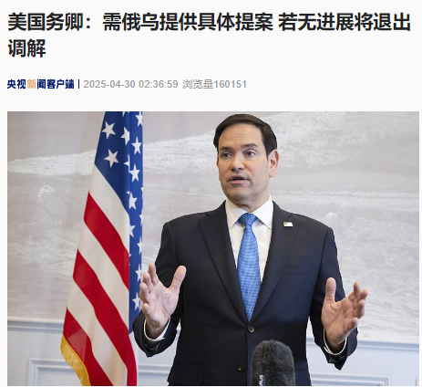 鲁比奥4月17日在巴黎与乌克兰、法国、英国、德国官员就乌克兰问题进行磋商,次日离开法国时在机场表示,如果短期内看不到俄乌达成一致的信号,美方不会继续撮合。