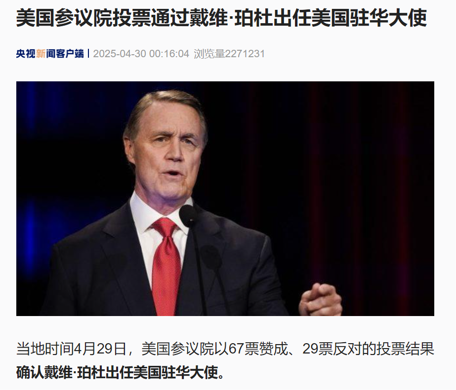 当地时间4月29日,美国参议院以67票赞成、29票反对的投票结果确认戴维·珀杜出任美国驻华大使。此举标志着美国政府在驻华大使职位上迈出了新的一步。