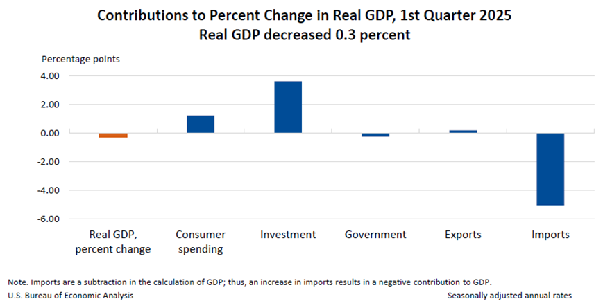 当地时间4月30日,美国商务部公布数据显示,2025年第一季度,美国国内生产总值(GDP)环比萎缩0.3%,创2022年以来最差季度表现。这标志着美国经济从2024年底的强劲消费和投资,到2025年初意外“踩刹车”。