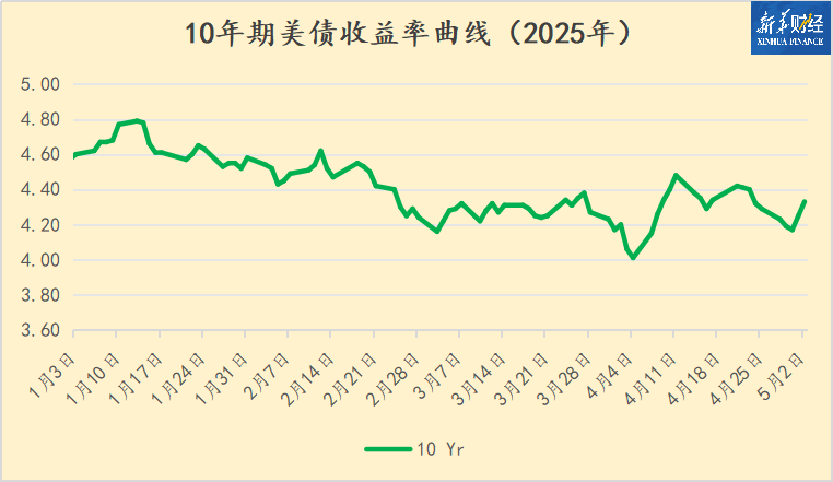 据美国财政部数据,截至当天收盘,2年期美债收益率飙升13BPs至3.83%;10年期美债收益率上涨8BPs至4.33%;30年期美债收益率涨5BPs至4.79%。与4月底相比,各期限美债收益率均有所上升,显示出市场情绪的波动。