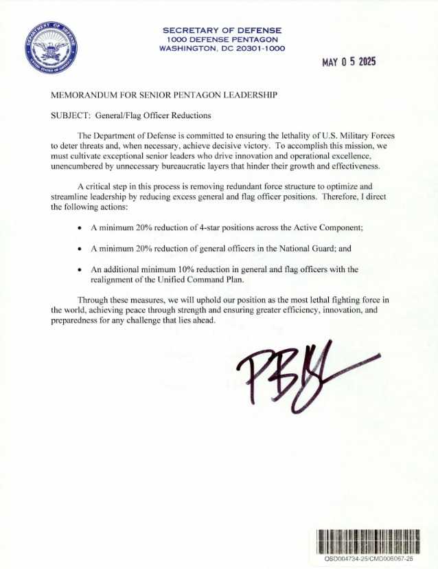 赫格塞斯在备忘录中表示,这一举措是“优化和精简领导层”的关键一步,旨在“消除冗余的部队结构,减少多余的将军和军官职位”,以提高军队效率和战斗力。