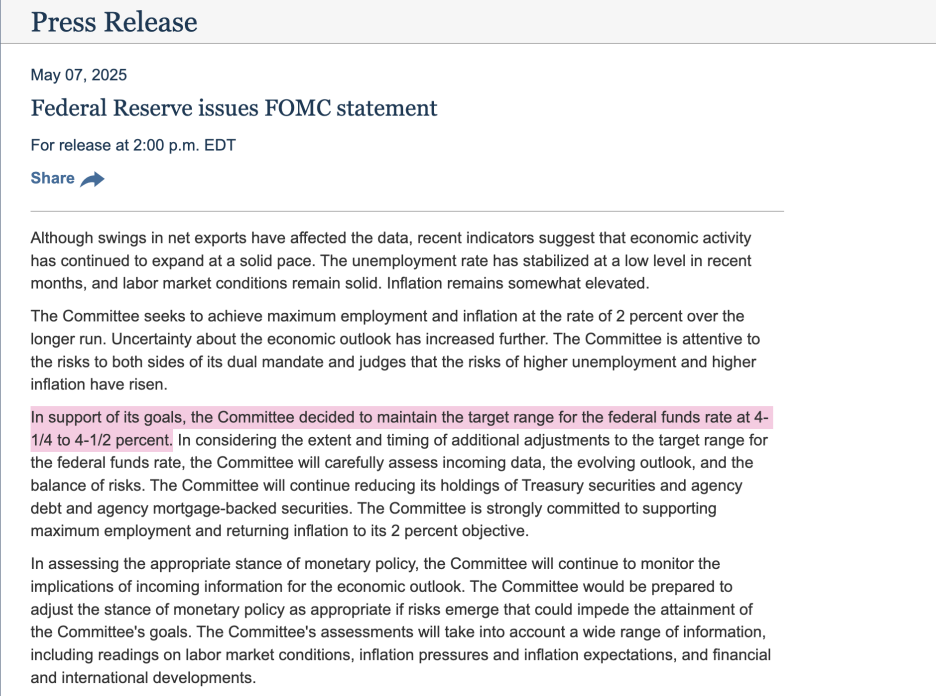 美联储连续第三次按下“暂停键”。北京时间5月8日凌晨,美联储公布最新利率决议,将联邦基金利率维持在4.25%至4.5%区间,符合预期,再次彰显其谨慎态度。