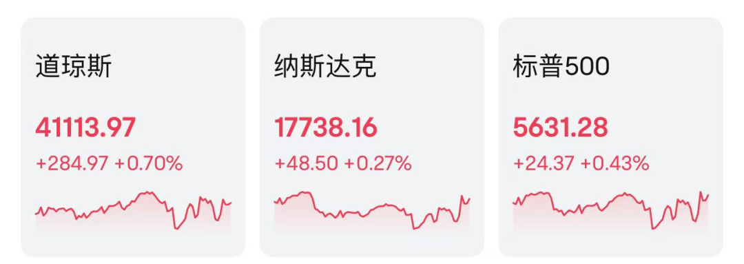 美东时间5月7日,美股三大指数齐涨。道指、标普500指数、纳指分别上涨284.97点、24.37点、48.50点,涨幅分别为0.70%、0.43%、0.27%。