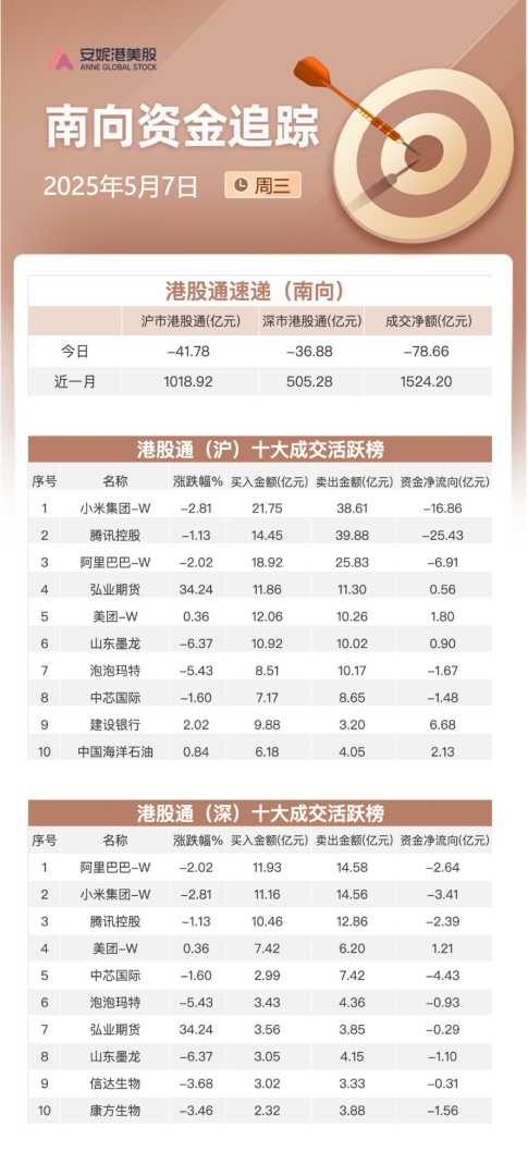 南向资金周三成交约1091.36亿港元,占恒指成交总额近半。全天净流出约78.66亿港元,沪港股通和深港股通均呈净流出。