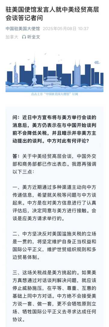 一、美方近期通过多种渠道主动向中方传递信息,希望就关税等问题与中方展开对话。中方在对美方信息进行了认真评估后,决定同意与美方进行接触。此次会谈是应美方请求举行的。