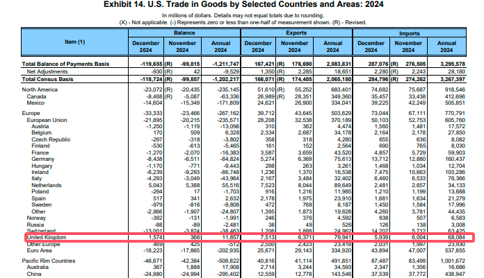 这些数字,或许可以在一定程度上解释:为何特朗普会把英国作为最先签订贸易协议突破口——两国间本身的贸易失衡问题就并不严重。甚至以特朗普过往的贸易“算法”计算,作为顺差国的美国还是“得利方”。