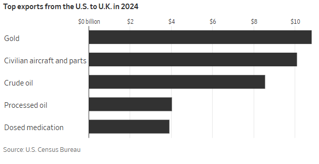 英国作为主要的北欧石油贸易中心,在2024年,美国向英国出口了约147亿美元的石油、天然气和各种矿物燃料,约占对英出口额的18%。其他主要的对英商品出口项目还包括108亿美元的黄金、101亿美元的民用飞机和零部件以及近70亿美元的机械。