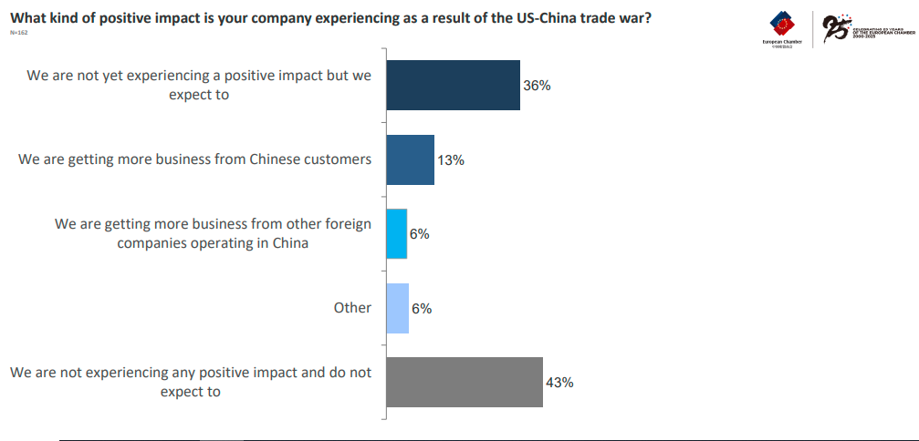 这项调查于上月进行,发现19%的受访企业已经因贸易战获得了更多中外客户业务。另有36%的企业尚未感受到直接积极影响,但预计将来会有所受益。
