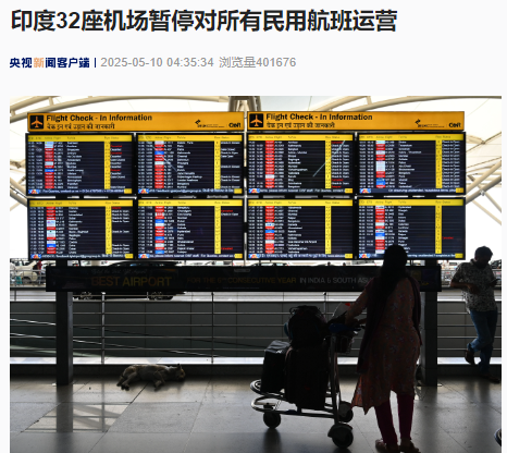 印度民航管理部门当地时间5月9日发布通告宣布,印度北部和西部的32座机场暂停对所有民用航班运营,直至5月14日。